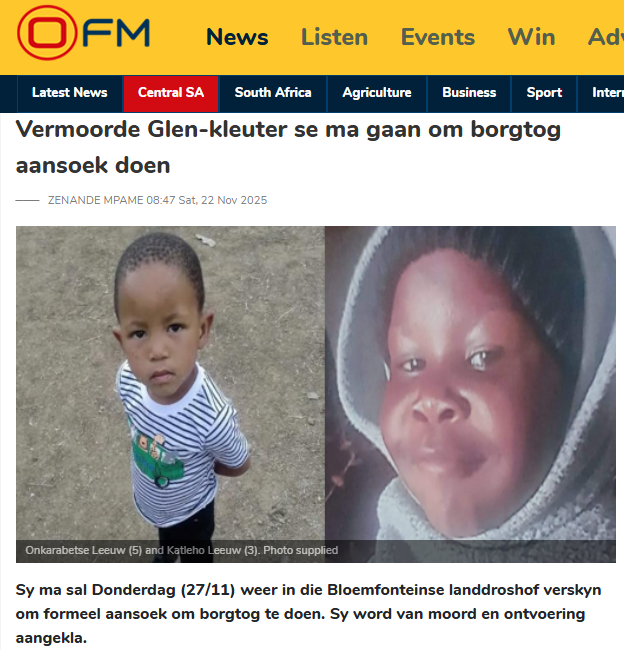 Intussen word die borgaansoek van Katleho se ma, Vuyiswa Leeuw (29), Vrydag (5 Desember) in dieselfde hof voortgesit. Sy word aangekla van die ontvoering en moord op Onkarabetse Leeuw (5), haar niggie se kind.