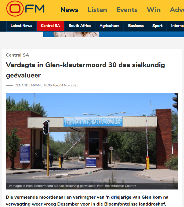 Die 30-jarige beskuldigde het Donderdag (4/12) virtueel uit die Grootvlei-gevangenis buite die stad voor die Bloemfonteinse landdroshof verskyn. Die saak is tot 26 Januarie 2026 uitgestel. Hy is begin November vir maandelange sielkundige waarneming na die Vrystaatse psigiatriese hospitaal verwys.