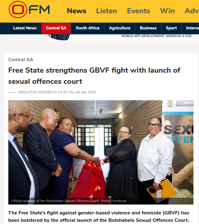 Meanwhile, the province’s fight against GBVF has been bolstered by the official launch of the Botshabelo Sexual Offences Court.