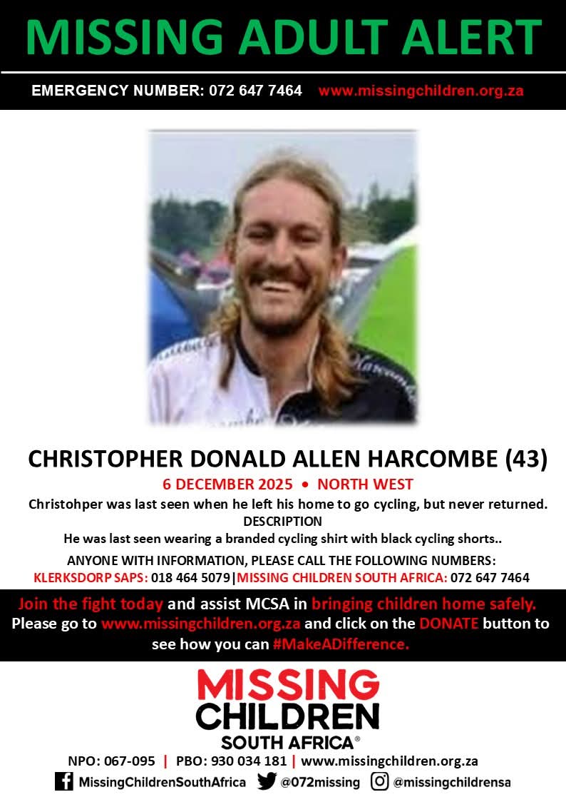 Christopher Don Alle Harcombe (42) het Saterdag (6/12) net ná 07:00 sy huis in Klerksdorp verlaat om fiets te ry. Hy is sedertdien nog nie weer gesien of van gehoor nie.