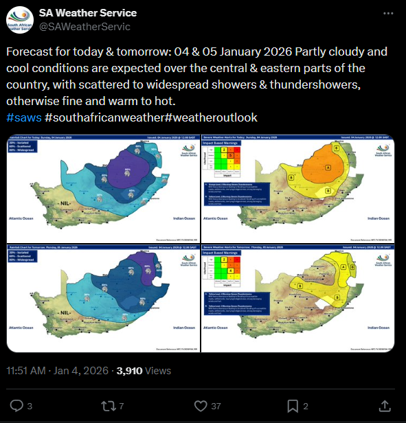 Residents should prepare for weather that is highly likely to cause minor disruptions, such as brief localised flooding or slight travel delays, due to potentially heavy rain or wind, the service said. Residents in the Free State, North West, and Northern Cape can, however, look forward to a spell of sunnier weather.