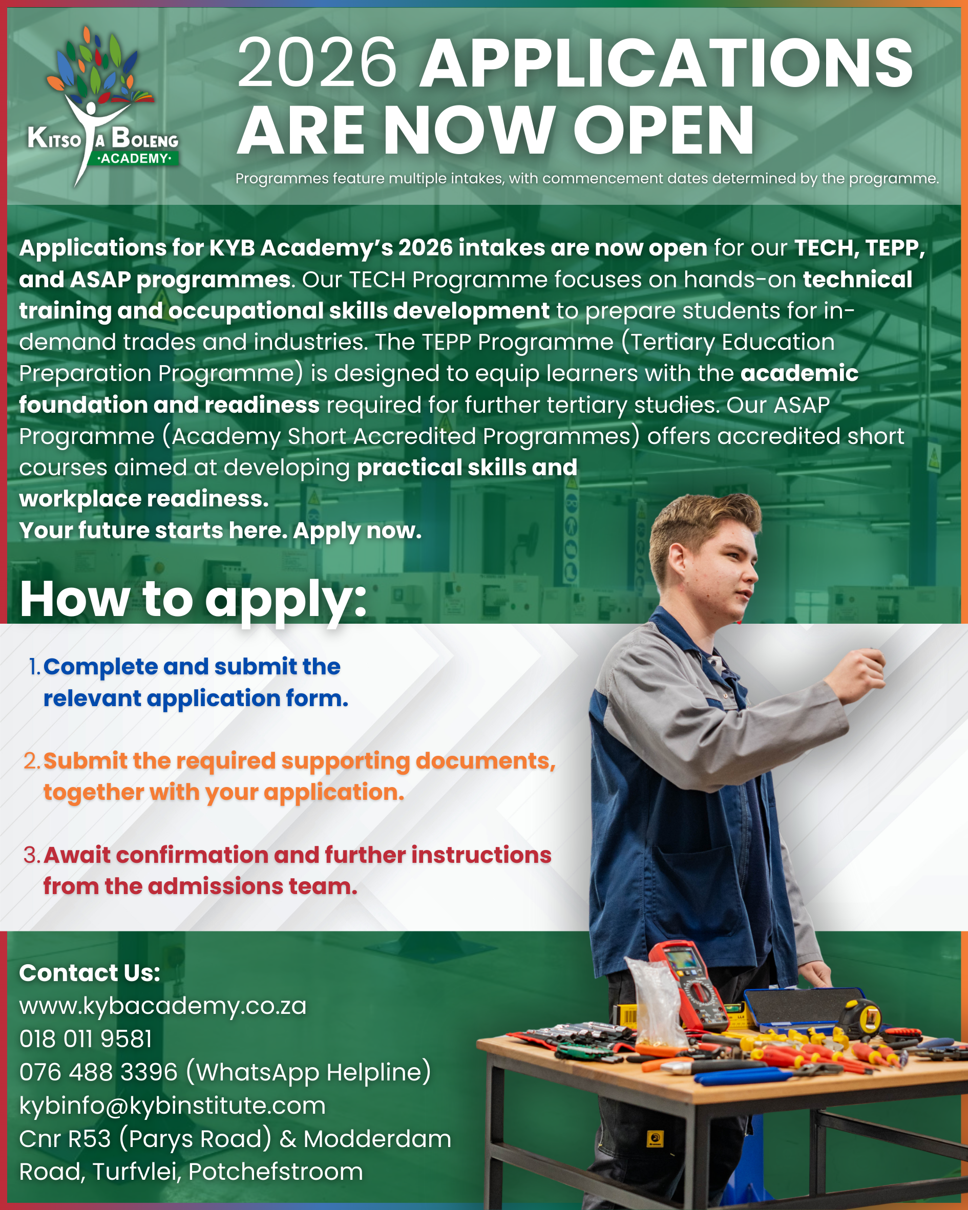 Whether you are an aspiring artisan or want to kickstart your career in the corporate world, KYB Academy provides the platform. Parents and students are invited to visit the campus in Potchefstroom to experience the modern learning environment firsthand.