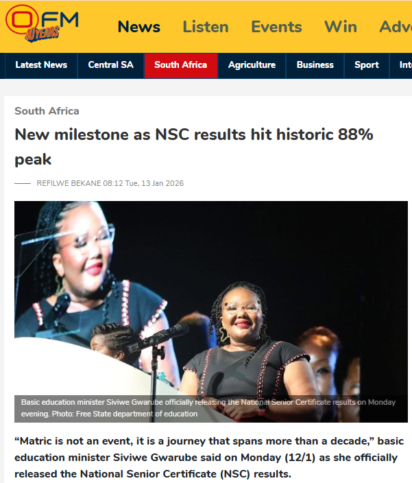 Basic education minister Siviwe Gwarube released the National Senior Certificate (NSC) results on Monday (12/1). She highlighted a historic achievement as the national pass rate climbed to a record 88%, an increase from the previous year’s 87.03%.