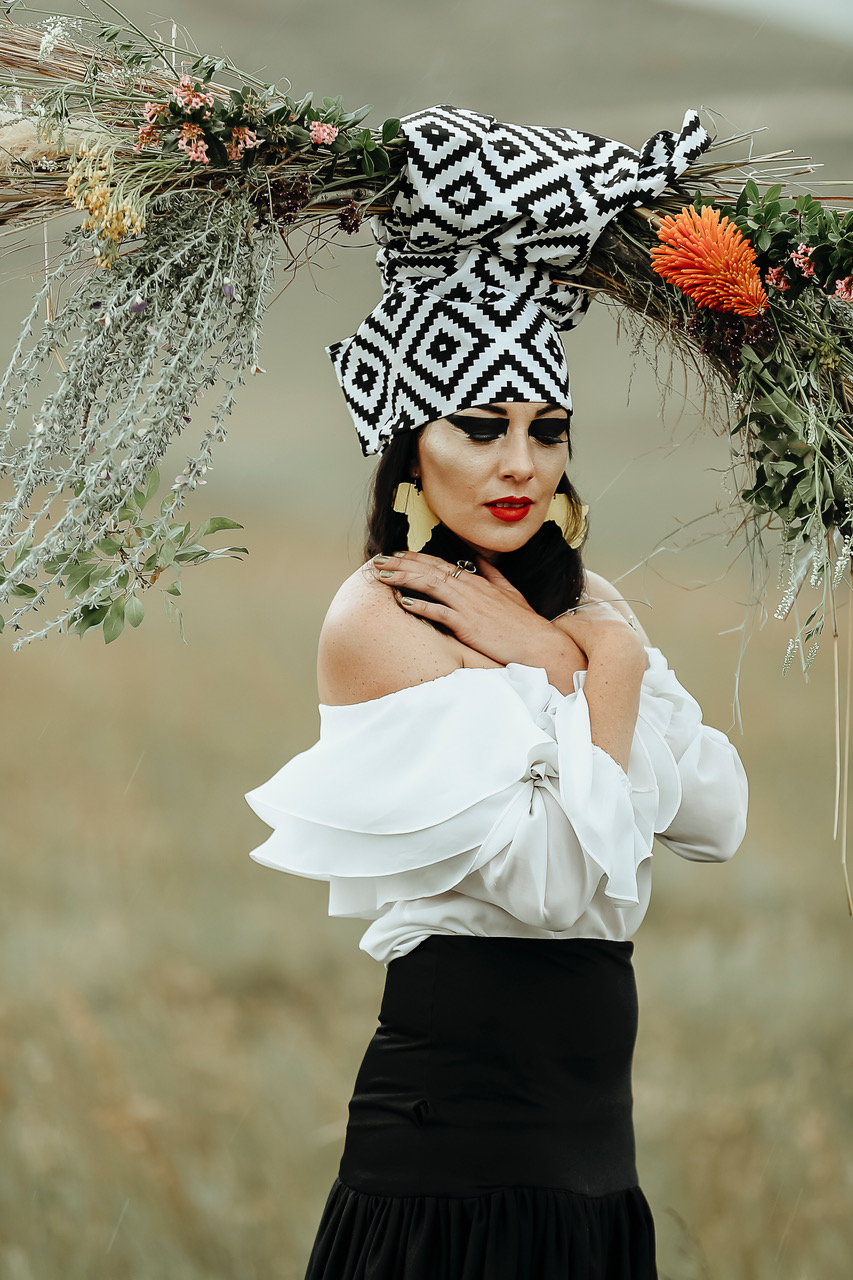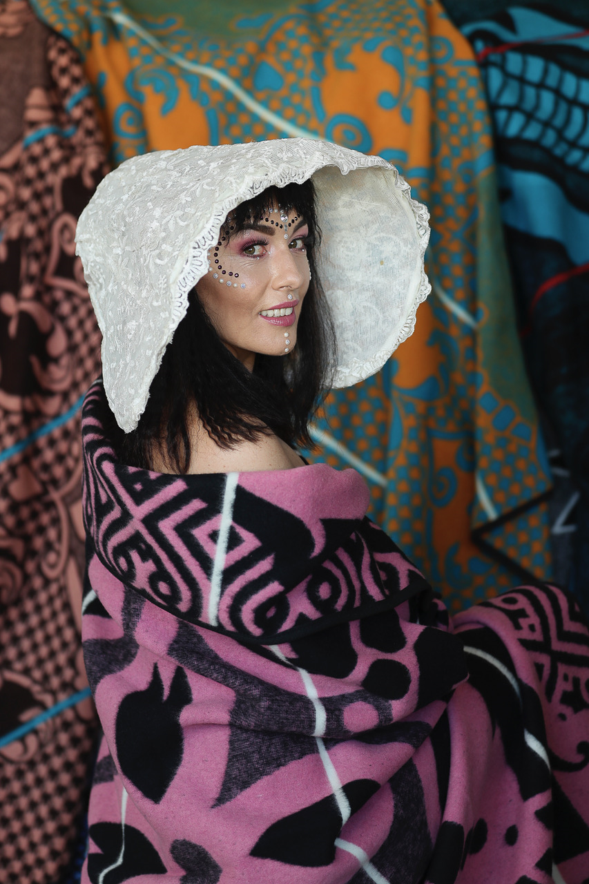 Kate Rok, hier met ’n Sotho-kombers om haar gevou, dra dikwel ’n Voortrekkerkappie. Foto verskaf