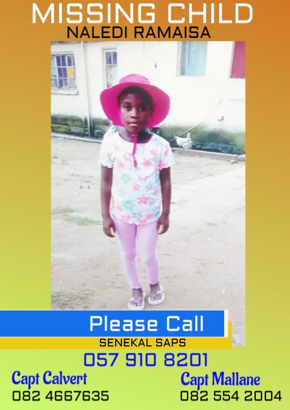 Enigiemand met inligting wat die polisie kan help om Naledi op te spoor, kan Senekal se polisie by 057 910 8201 of Stop Misdaad by 08600 10111 bel.