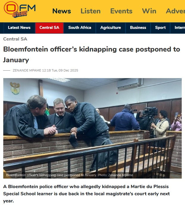 Ontvoeringsaak: Bloemfontein-beampte se saak uitgestel vir beslissing─── CHARNÉ VAN DER MERWE 14:52 Fri, 16 Jan 2026