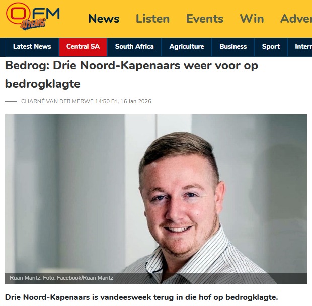 In ’n aparte saak duur Ruan Maritz (30) se drie dag lange verhoor tot Vrydag (23/1) in die Hartswater-handelsmisdaadhof. Hy staan tereg op bedrogklagte nadat hy na bewering beleggers uit R2 miljoen bedrieg het.