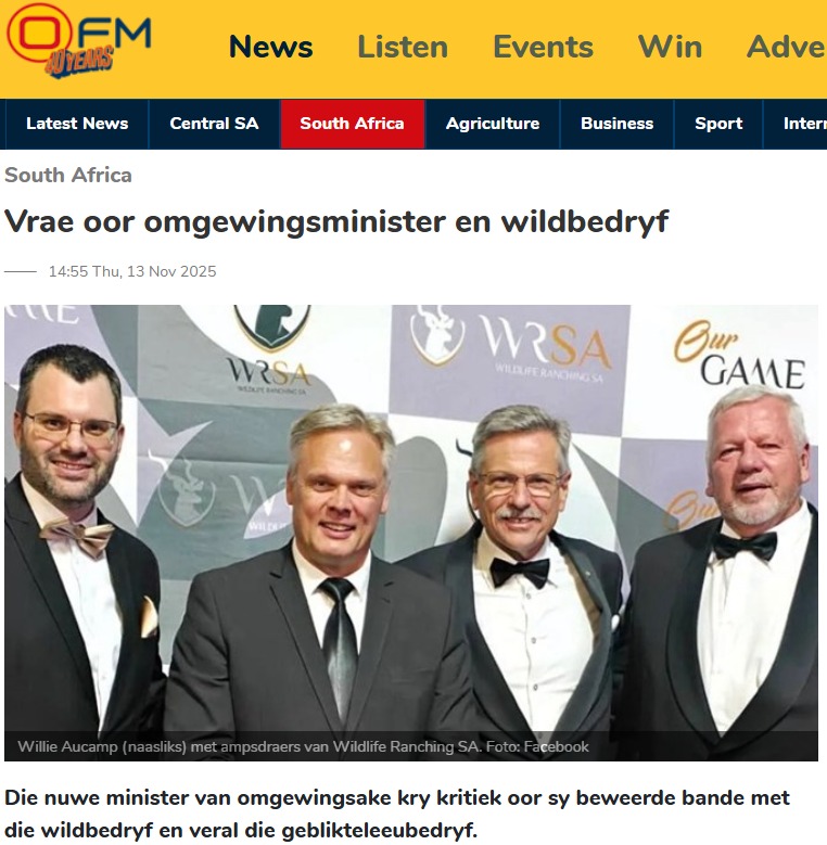 Aucamp ontken enige bande met die leeusektor. Hy sê nie hy of enige familielid het enige verbintenis met dié bedryf óf met enige onderneming wat daarby betrokke is nie.