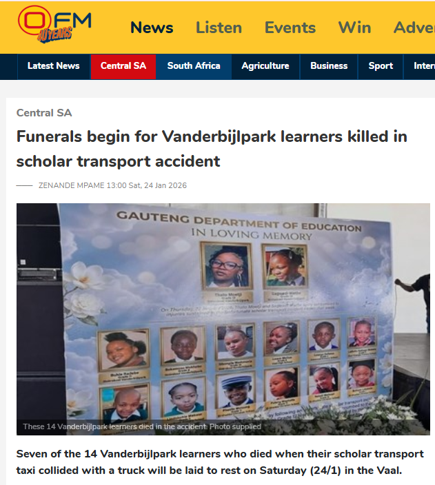 Parents urged to report unsafe scholar transport after Vanderbijlpark scholar transport accident─── ZENANDE MPAME 13:31 Mon, 26 Jan 2026