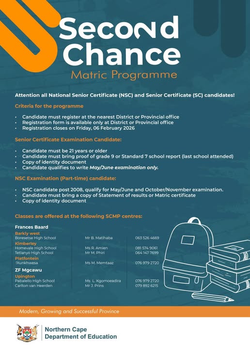 “All eligible learners are urged to register before Friday, 6 February. The programme caters to candidates who wrote matric from 2008 onwards and wish to improve their results, adults aged 21 and older who qualify to rewrite their senior certificate, and the school-leaving certificate for adult learners.”