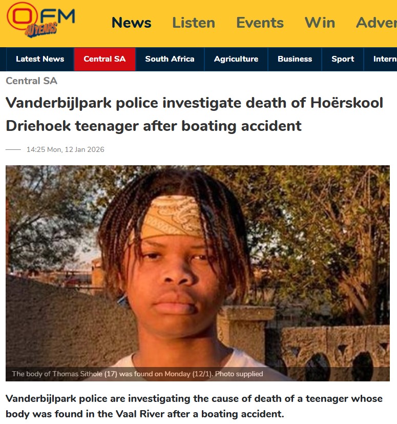 The body of Thomas was found on Monday, 12 January, two days after he was reported missing by two boys on jet skis near the bridge at Stonehaven on Vaal. The incident reportedly occurred around 18:00, but his parents were only notified four hours later.