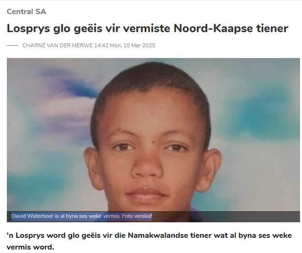David Waterboer (14) is laas op 25 Februarie verlede jaar gesien. “Namakwaland se taakmag was besig met roetineondersoeke by die Waterboer-woning op Nababeep. Die gemeenskap sal op hoogte gehou word soos die ondersoek ontvou.