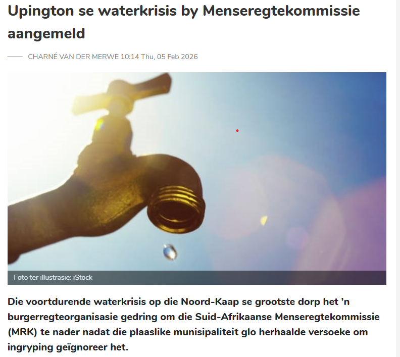 OFM Nuus het vroeër berig AfriForum het die Dawid Kruiper-munisipaliteit op Upington by die MRK verkla omdat hulle nie reageer op ’n skrywe oor die waterkrisis nie.