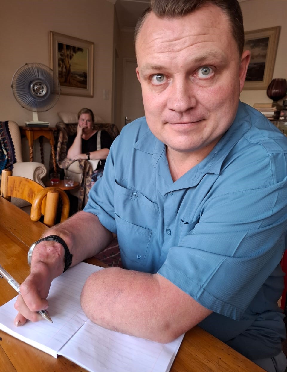 “Met my prostesehand en die vaardigheid van my halwe ander arm kan ek alles doen wat nodig is, selfs vir my vrou, Surina, help skottelgoed was, of produkte vir kliënte van die rak afhaal.