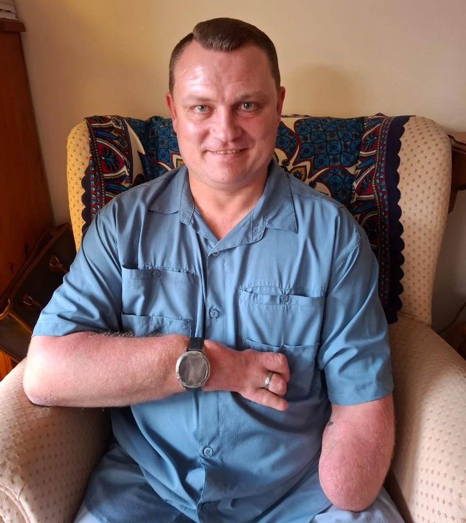 Conrad van Schalkwyk se regterhand is by die pols afgesny en in die hospitaal het hy die helfte van sy linkerarm weens gangreen verloor. Hy het gewerk met ’n masjien wat metaal buig.
