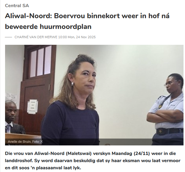 Beplande moord op man: Boervrou van Aliwal weer voor hof─── CHARNÉ VAN DER MERWE 13:18 Mon, 09 Feb 2026
