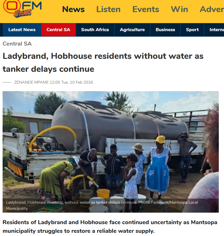 Meanwhile, the DA said it will formally report the municipality to the Free State Treasury and demand full accountability for the ongoing water crisis in Hobhouse and Dipelaneng.
