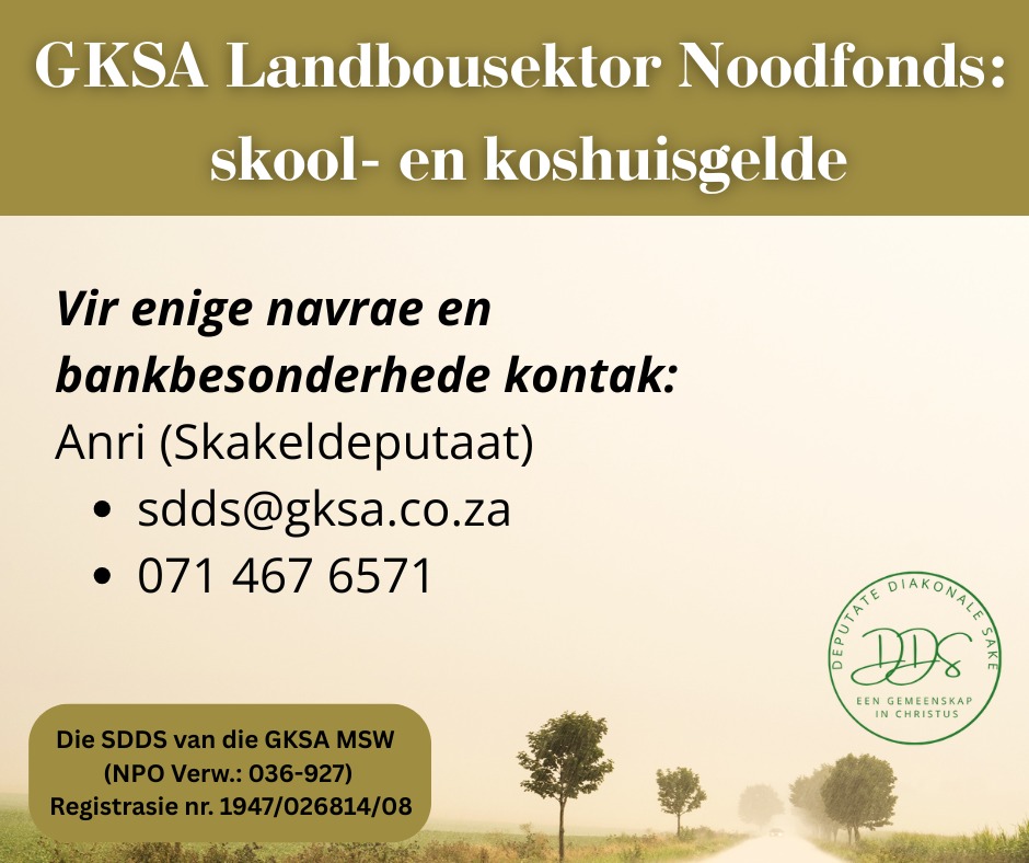 Die Gereformeerde Kerke in Suid-Afrika (GKSA) het ’n fonds gestig om boere met veral kinders se skool- en koshuisgeld by te staan te midde van die geweldige druk wat hulle beleef, veral nou met die bek-en-klouseer-uitbreking.