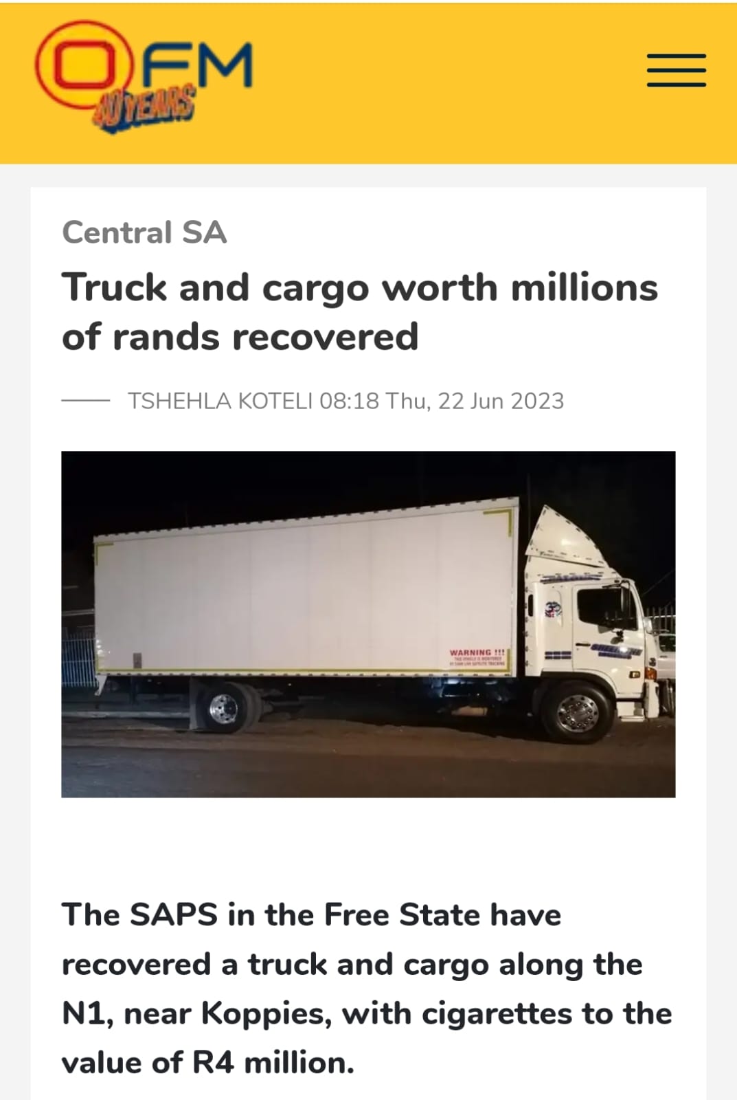 In response to the incident, Free State police have urged truck drivers to exercise extreme caution while travelling, especially at night and in remote areas.