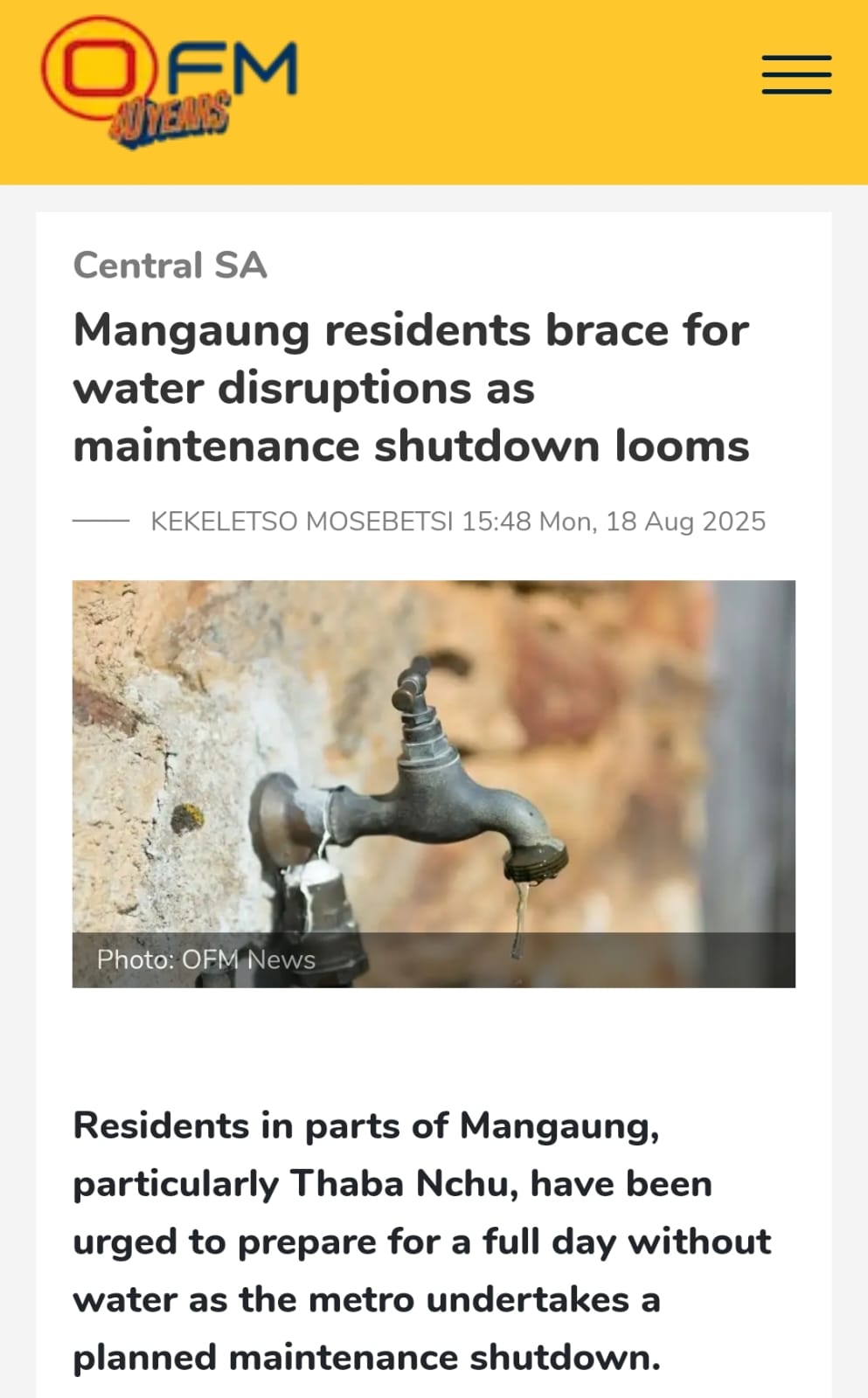 Pump failures, low storage strain Mangaung’s water supply─── KEKELETSO MOSEBETSI 09:32 Sun, 15 Feb 2026