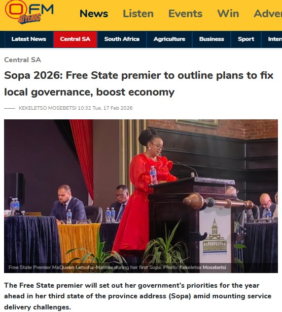 Free State Sopa budget cut by 25%─── KEKELETSO MOSEBETSI 15:37 Wed, 18 Feb 2026