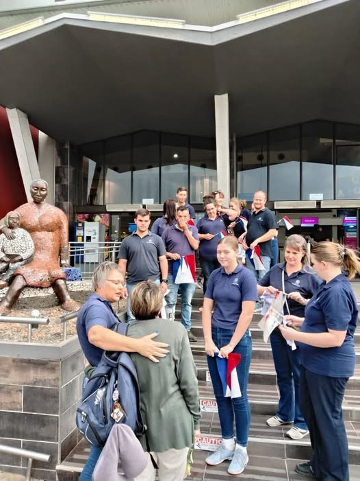 Die Voortrekkers groet Karen du Plessis in Oktober 2025 op die lughawe. Foto verskaf