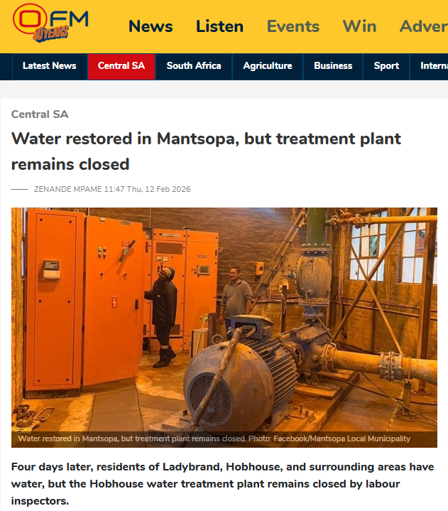 If this situation is improperly declared a disaster, it will create a dangerous precedent, enabling municipalities to neglect maintenance, misuse public funds, and later seek to mask incompetence through emergency declarations, he said. Residents of Ladybrand, Hobhouse, and surrounding areas did not have water for four days because the Hobhouse water treatment plant was closed by labour inspectors.
