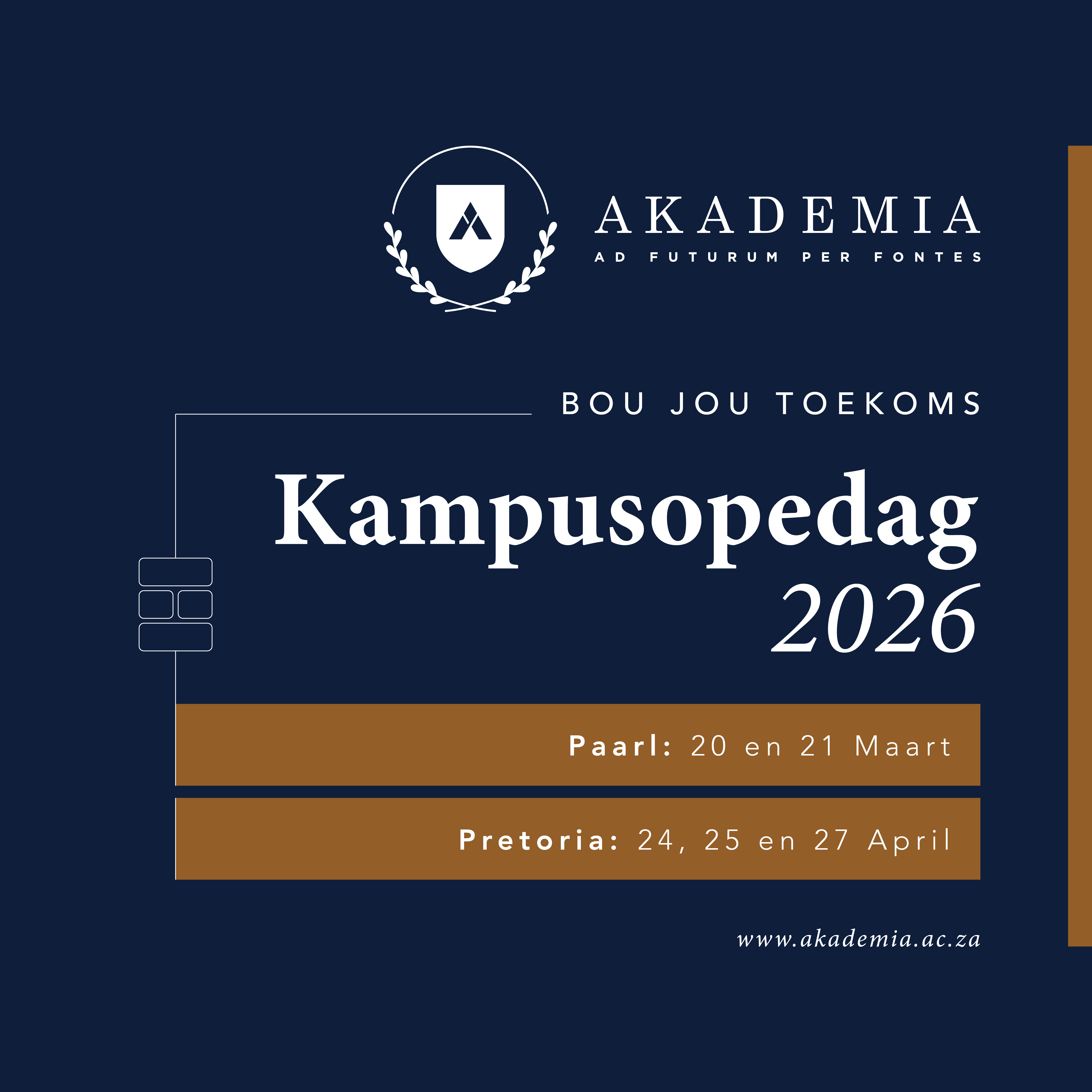 Bespreek vir die kampusopedae in die Paarl (20 en 21 Maart) of Pretoria (24, 25 en 27 April) hier: https://akademia.ac.za/kampusopedag-2026/