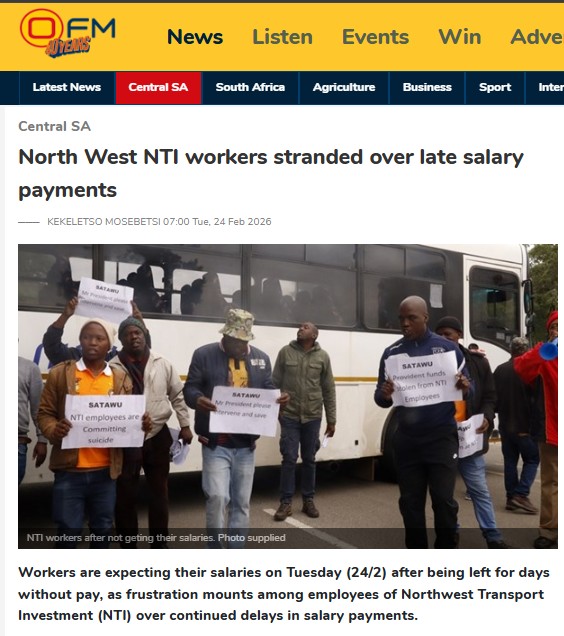 Last month, North West Transport Investment (NTI) workers protested outside the legislature, demanding payment of delayed wages after a technical error disrupted the payment process.