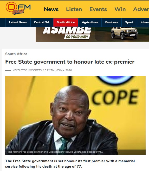 Numerous road closures for Mosiua Lekota’s memorial service─── KEKELETSO MOSEBETSI 09:38 Thu, 12 Mar 2026