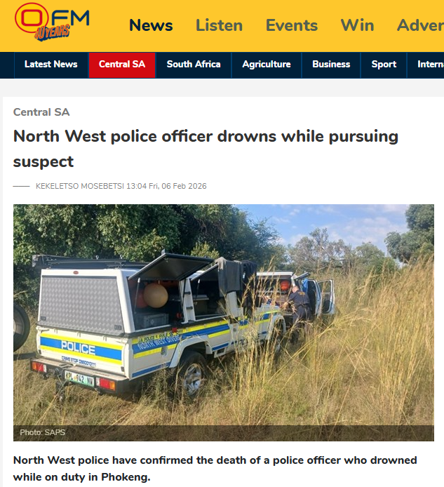 Three weeks earlier, another on-duty police officer died in the province. Cst. Gift Mota (25), originally from Ermelo in Mpumalanga, drowned while pursuing a suspect near Phokeng.