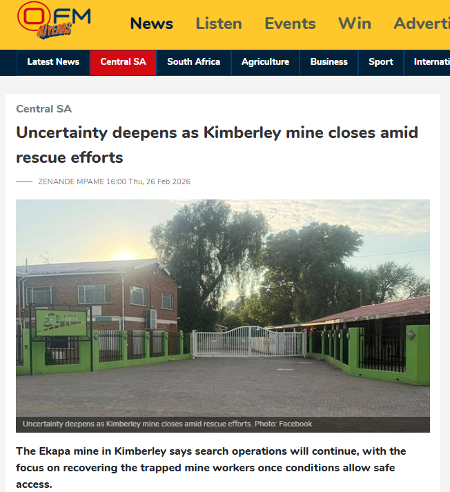 Ekapa intensifies rescue efforts at Kimberley mine─── ZENANDE MPAME 11:50 Fri, 20 Mar 2026