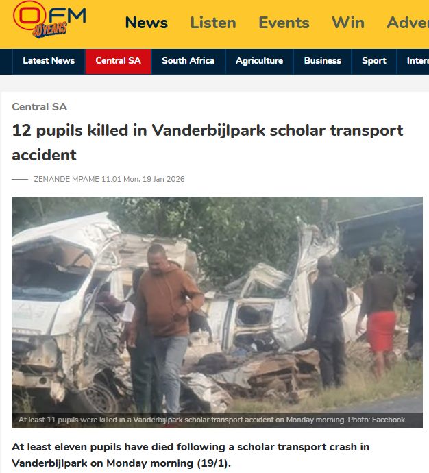 On Monday, 19 January, learners from various primary and secondary schools were travelling in a Toyota Quantum when the vehicle collided with a truck. Eleven learners died instantly when the minibus collided with a side tipper truck, causing it to veer off the R553.