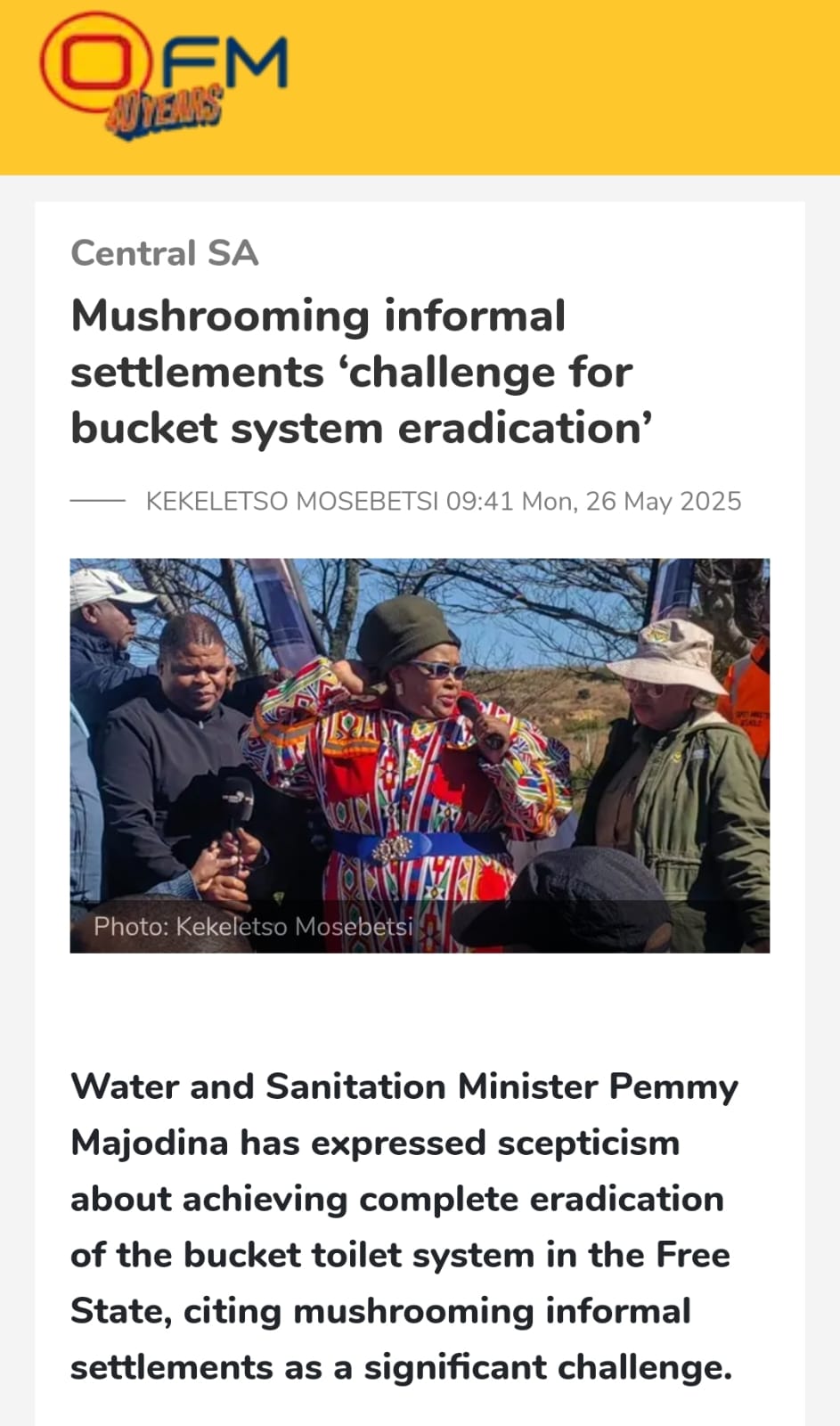 Although her department provides financial support to municipalities through infrastructure grants, many Free State municipalities continue to struggle to maintain infrastructure and eliminate the bucket system. This has led to growing frustration among affected communities.