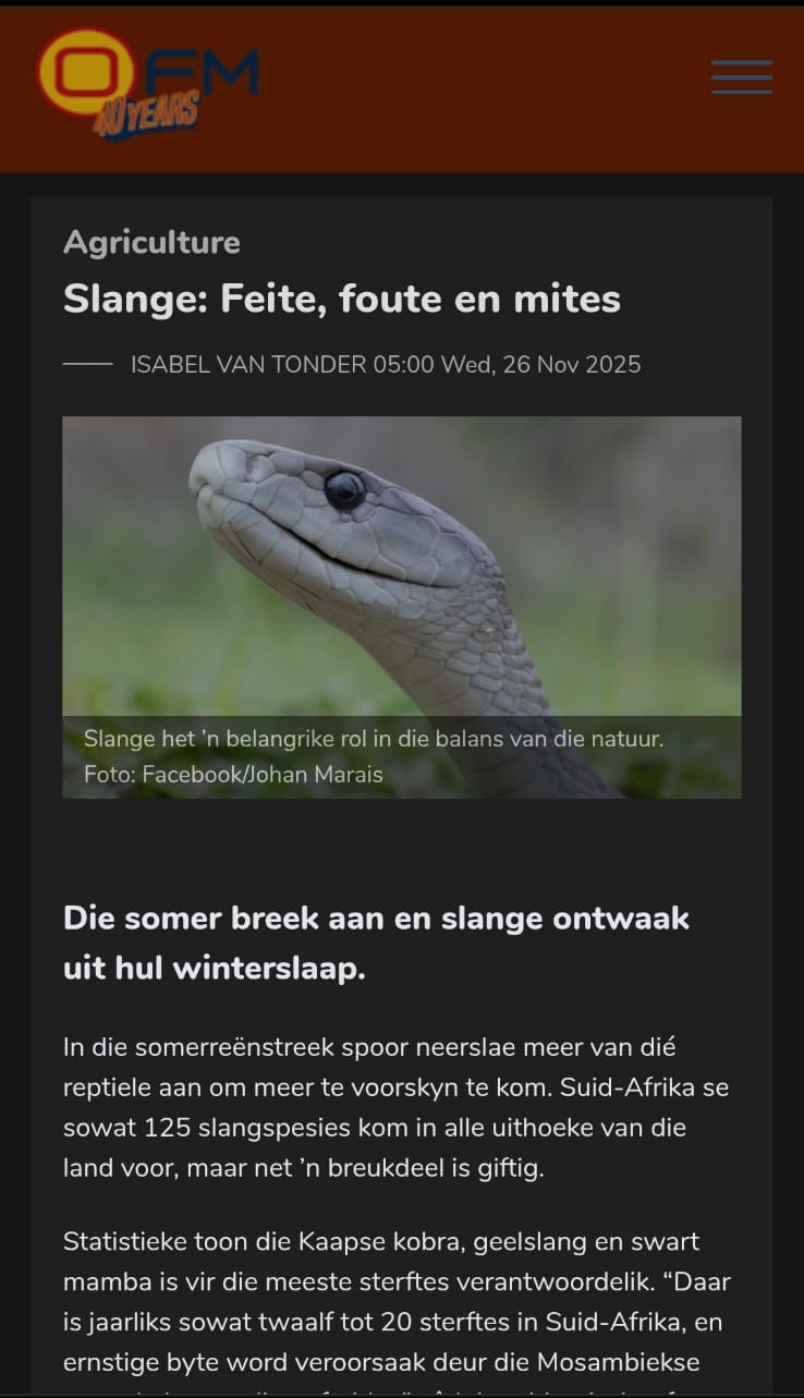 Johan Marais, hoof van die Afrika-slangbyt-instituut in Pretoria-Oos, waarsku dat slange se aktiwiteit weens warmer weer en langer reënseisoen verhoog. “Mense moet bewus wees van hoe om op te tree wanneer hulle ’n slang teëkom en veral wat om nié te doen nie.”
