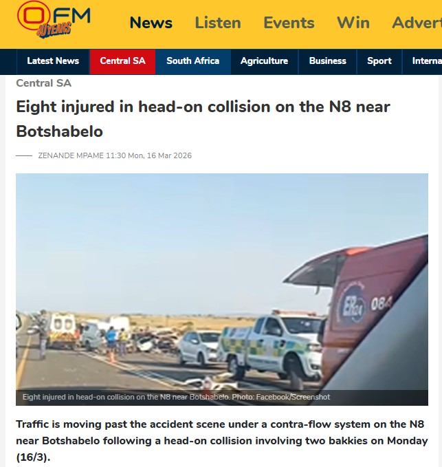 The N8 between Bloemfontein and Botshabelo is known for its fatal accidents; the recent accident included a police bakkie and a security company bakkie in March.
