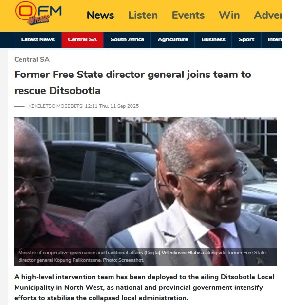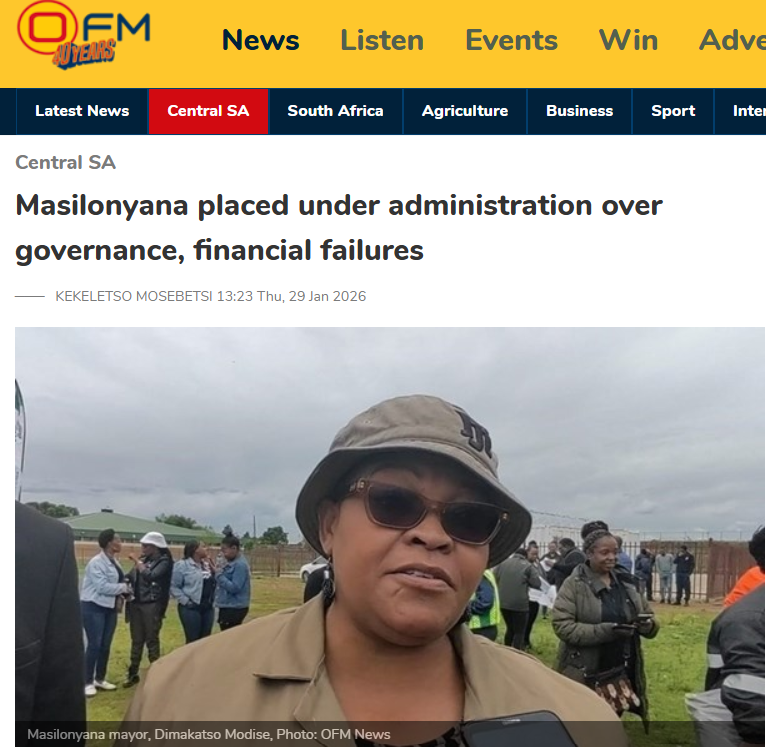 Masilonyana and Nketoana are among the municipalities in the Free State placed under intervention in terms of Section 139(1)(b) of the Constitution due to serious concerns, including financial mismanagement, governance failures, mounting debt, and adverse audit outcomes.