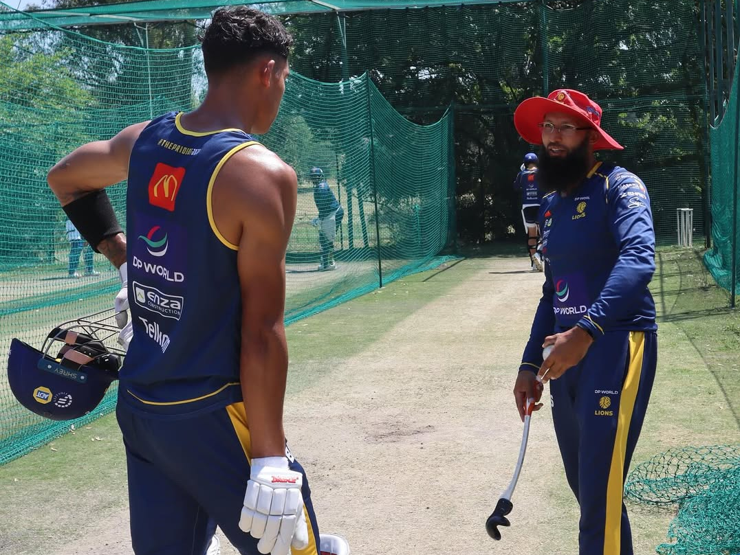 Cole Abrahams working with the Proteas great, Hashim Amla, at the Lions. Photo: Instagram