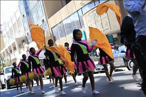 Among the people at the parade were schoolkids, marching bands, cheerleaders, Miss Bloemfontein Rose, the Celtic soccer team, and government officials.