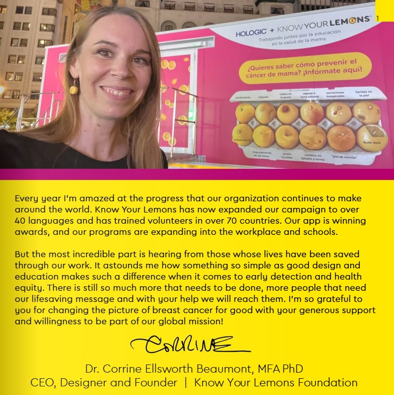 The roots of the “Know Your Lemons” campaign lie in the face-to-face experiences of its founder, Dr. Corrine, with breast cancer; the passing of both her grandmothers and a close friend. This heartbreaking reality moved her to action after she uncovered a surprising and alarming gap.