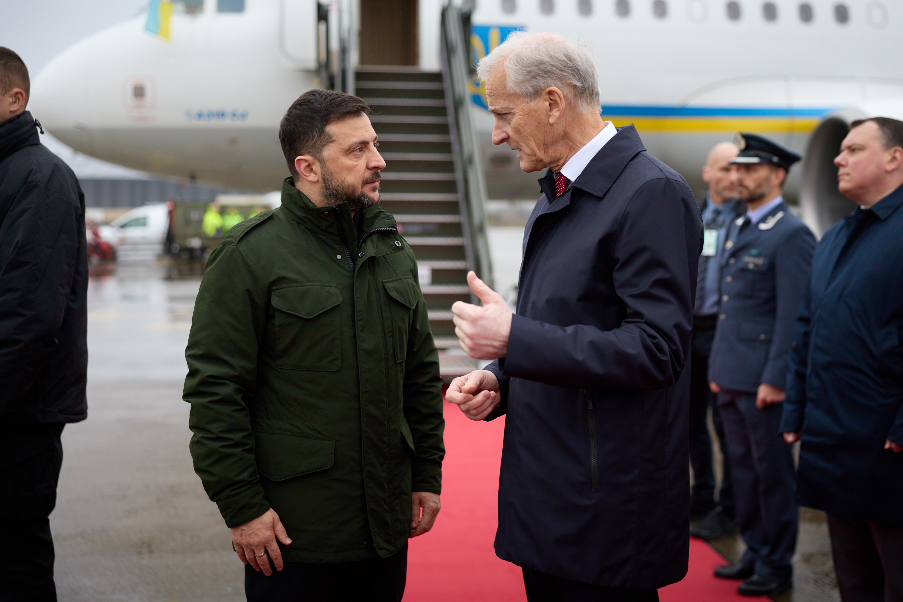 Pres. Wolodimir Zelenski word Woensdag deur premier Jonas Gahr Støre van Noorweë verwelkom. Foto: X