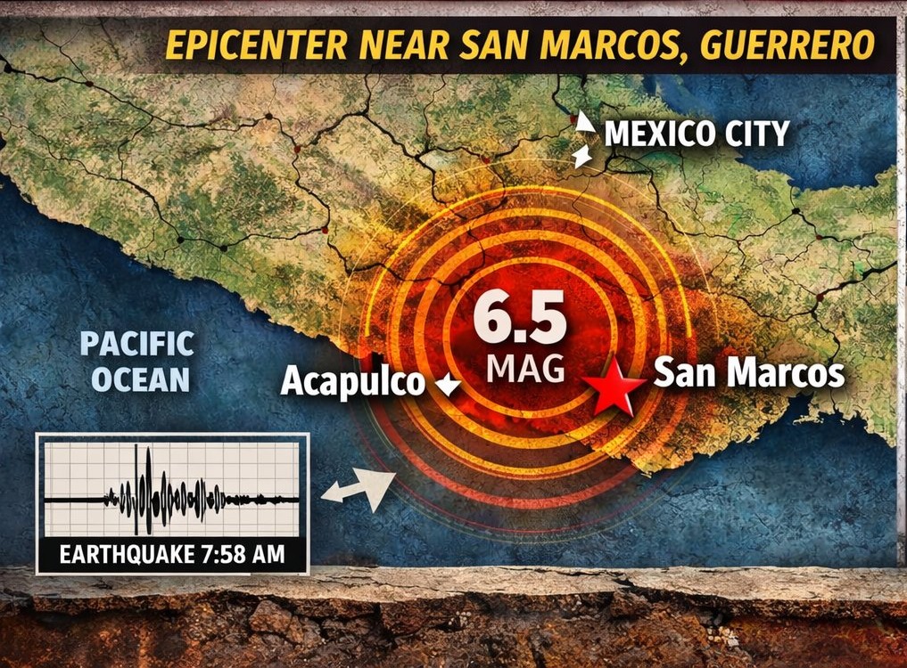 Die BBC berig die aardbewing het omstreeks 07:58 plaaslike tyd gebeur naby die dorp San Marcos in die staat van Guerrero naby die gewilde toeristedorp Acapulco aan die Stille Oseaan. Skuddings is tot in Mexikostad gevoel en mense het hul huise ontruim.