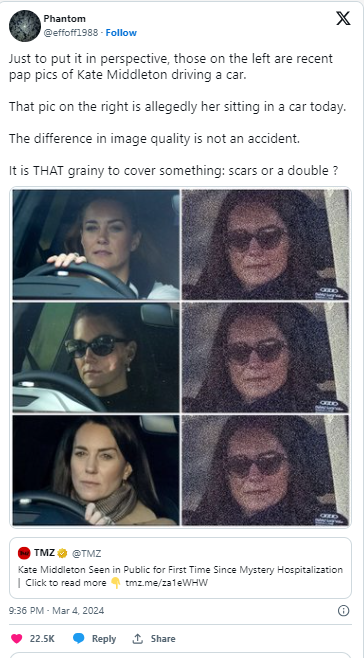 “Hold on a minute there internet. Someone removed the distortion from the Kate Middleton image produced on TMZ,” @CarmenGranddau captioned a digitally enhanced snap of the royal shared to Twitter. “Prince William, please come and ID your wife. Harpo, who dis?”