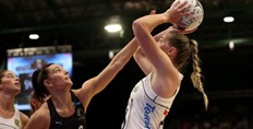 Elmere van der Berg fights for the ball against Australian goalkeeper Sarah Klau. Photo: Lauren Morgan/Netball Australia