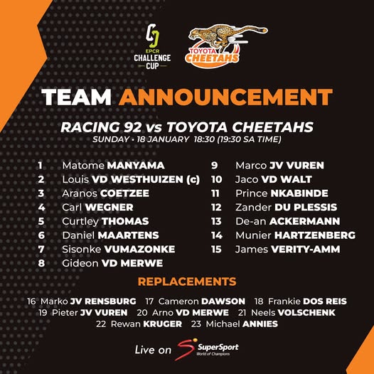 The Toyota Cheetahs will finish their EPCR Challenge Cup campaign on Sunday (18/1) when they take on Racing 92 in a clash for pride at the Paris La Défense Arena. Kick-off is scheduled for 18:30 (19:30 SA time).