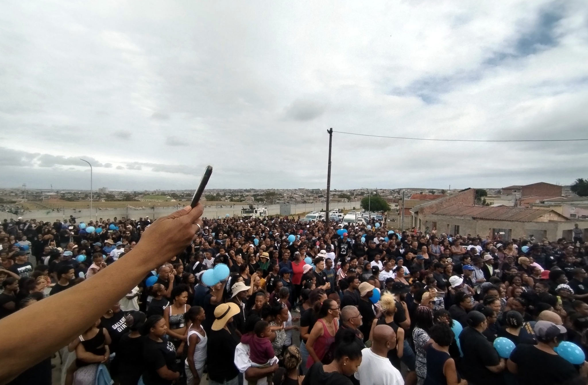 Inwoners het blou ballonne vrygelaat tydens die betoging vir geregtigheid Sondag. Foto: Facebook/Felicia R Denston
