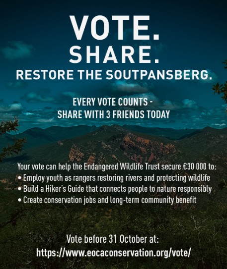 Die Trust vir Bedreigde Wildlewe (EWT) vra die publiek se steun nadat hy op die kortlys gekom het vir ’n gesogte bewaringstoekenning van €30 000 om die skouspelagtige Soutpansbergreeks in Limpopo te herstel en bewaar.