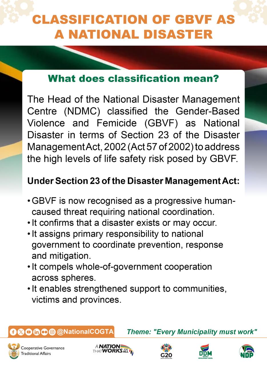 “The classification will remain in place until GBVF no longer meets the definition of a disaster. Minister Hlabisa stressed that this step consolidates efforts across society, reaffirming that GBVF is a national emergency requiring united action not only from women, but from every sector of the country.”