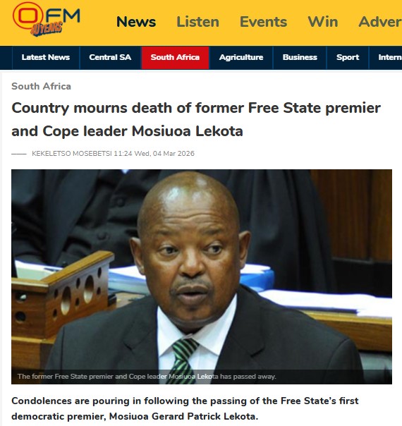 The Kroonstad-born Mosiua Lekota died in the early hours of Wednesday (3/4) after a period of illness. Lekota served as the first premier of the Free State from 1994 to 1996. He later founded the Congress of the People (Cope), leading the party as its president and remaining an influential voice in national politics for decades.