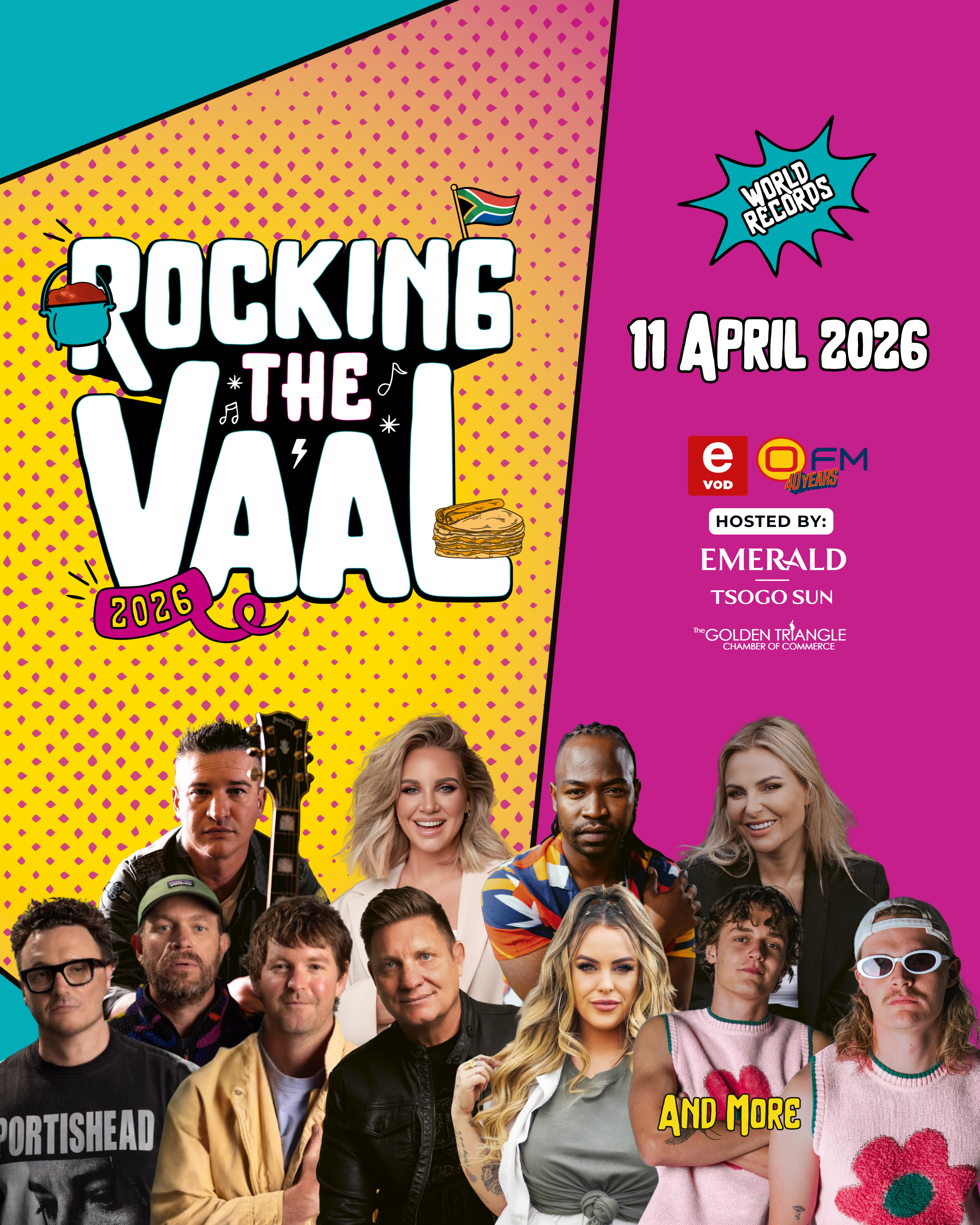 The Who is Rocking the Vaal competition is made possible by Emerald Resort. Enjoy a full day of live music on 11 April 2026 with Karlien van Jaarsveld, Kurt Darren, Demi Lee Moore, Refentse, Die Heuwels Fantasties and more. Plus, there will be two world record attempts and great food! Tickets from R249, kids under 13 free. Book now at Tixsa.